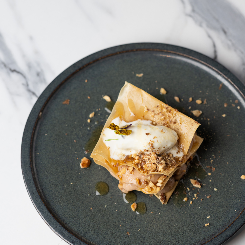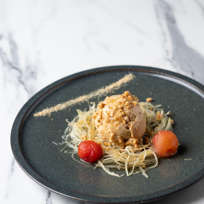 Spring roll pastry, apricot syrup, yoghurt sorbet.