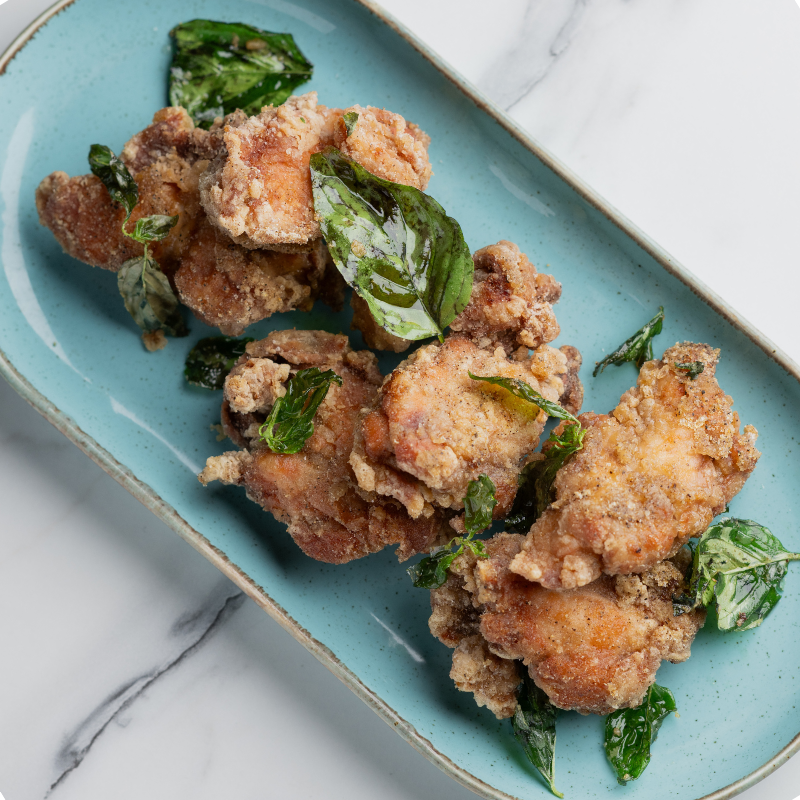 chilli & szechuan pepper, assorted mushroom, crispy fried kailan.(v)(vgo)(gf)